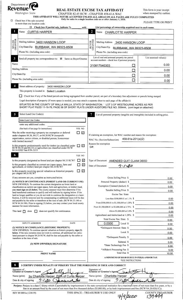 | 1 | 07/20/2020 | QCD | QUIT CLAIM DEED | HARPER CURTIS E | HARPER CHARLOTTE | | | | 139444 | 2020-06935 |