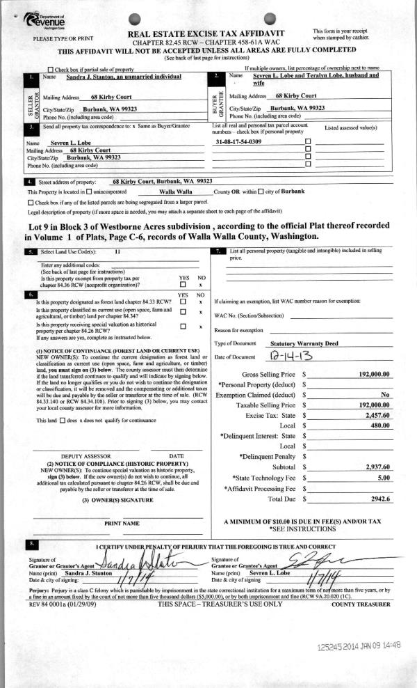 | 2 | 01/09/2014 | WARRANTY D | WARRANTY DEED | STANTON SANDRA J | LOBE SEVREN L & TERALYN | | | $192,000.00 | 125245 | 2014-00180 |