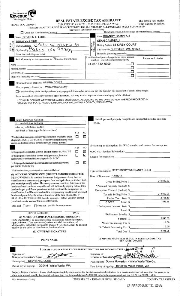 | 1 | 10/31/2016 | SWD | STATUTORY WARRANTY DEED | LOBE SEVREN L & TERALYN | CAMPEAU SEAN & BRANDY | | | $218,500.00 | 131355 | 2016-09010 |
