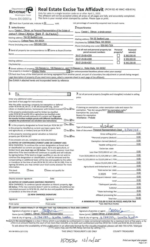 | 1 | 12/16/2025 | DPR | DEED OF PERSONAL REPRESENTATIVE | OLTMAN JOSH P | OLTMAN CASSIE L & | | | | 150536 | 2025-07744 |