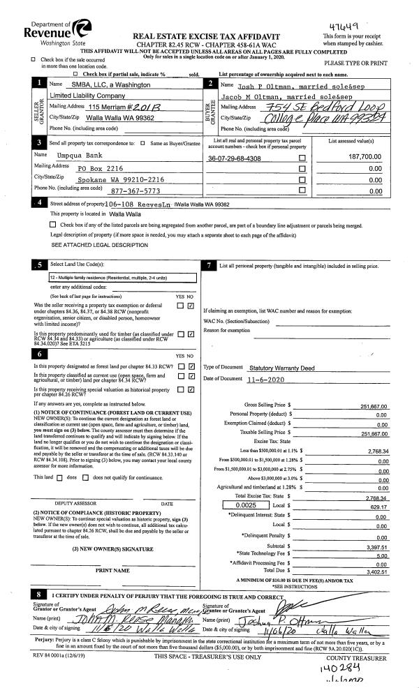 | 2 | 11/06/2020 | SWD | STATUTORY WARRANTY DEED | SMBA LLC | OLTMAN JOSH P | | | $251,667.00 | 140284 | 2020-11723 |