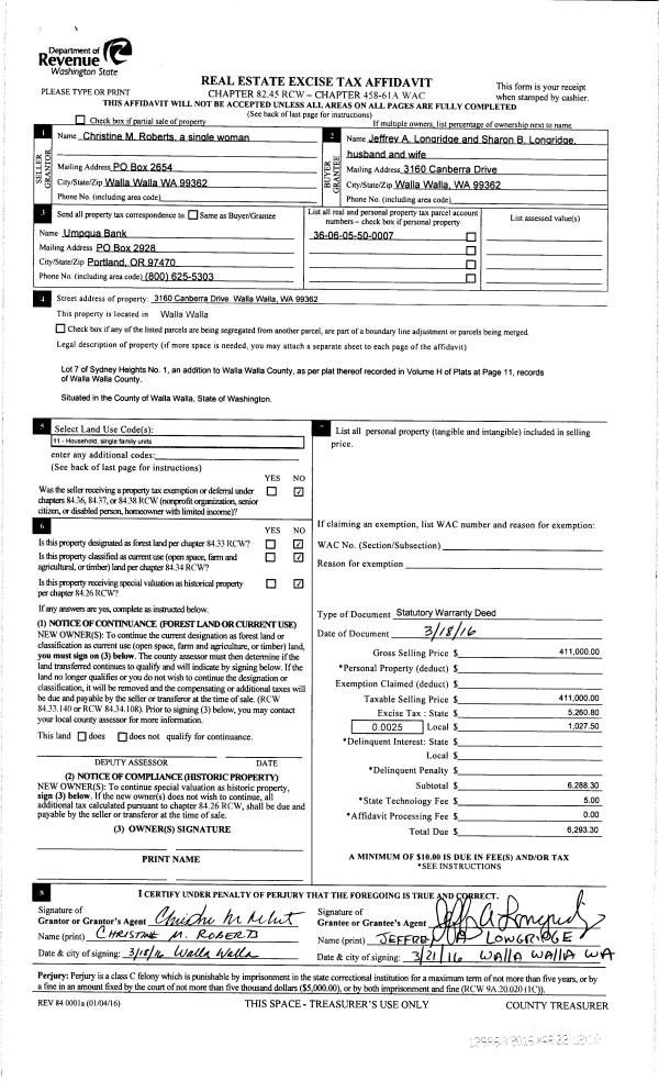 | 2 | 03/22/2016 | SWD | STATUTORY WARRANTY DEED | ROBERTS CHRISTINE M | LONGRIDGE JEFFREY A & SHARON B | | | $411,000.00 | 129868 | 2016-02117 |