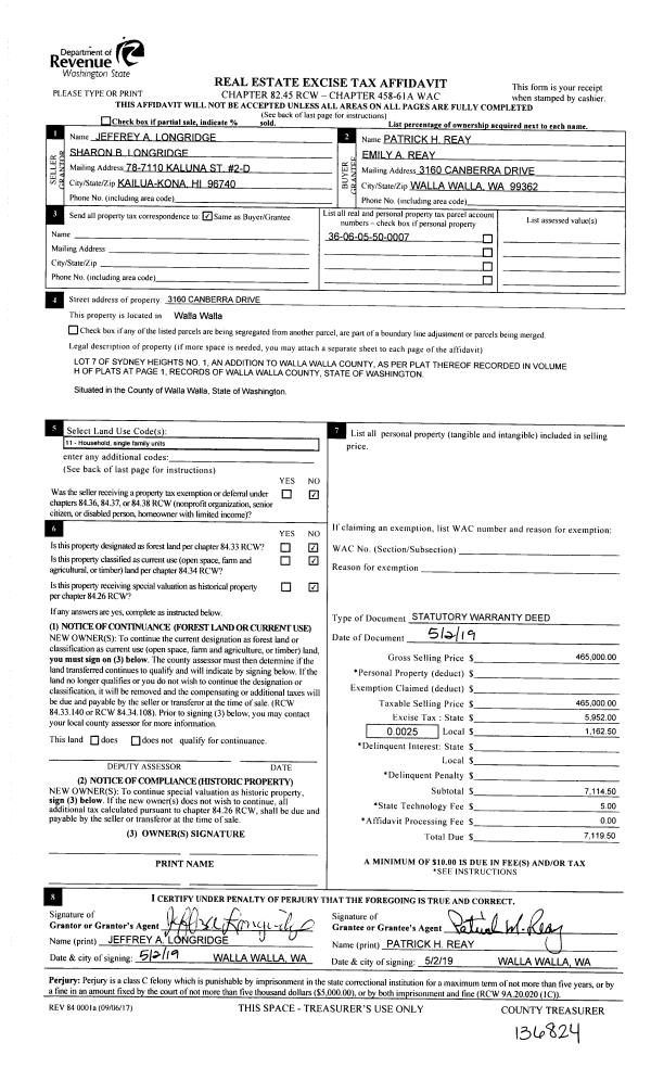 | 1 | 05/03/2019 | SWD | STATUTORY WARRANTY DEED | LONGRIDGE JEFFREY A & SHARON B | REAY PATRICK H & EMILY A | | | $465,000.00 | 136824 | 2019-02918 |