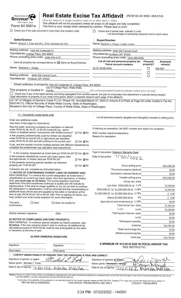 | 1 | 07/22/2022 | SWD | STATUTORY WARRANTY DEED | FORTE MICHAEL T | GREGG SHARLENE L | | | $652,000.00 | 144351 | 2022-06185 |