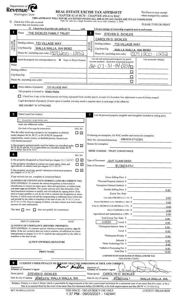 | 1 | 09/03/2021 | QCD | QUIT CLAIM DEED | SICKLES FAMILY TRUST | SICKLES STEVEN D & CAROLYN D | | | $0.00 | 142441 | 2021-10907 |