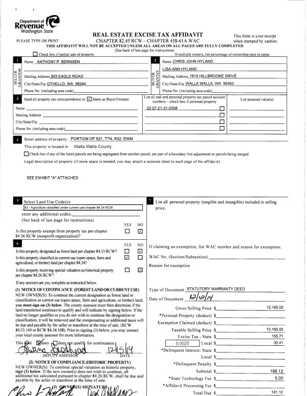 | 2 | 12/15/2014 | SWD | STATUTORY WARRANTY DEED | BERNSEN ANTHONY P | HYLAND CHRIS JOHN & LISA ANN | | | $12,165.00 | 127101 | 2014-09074 |