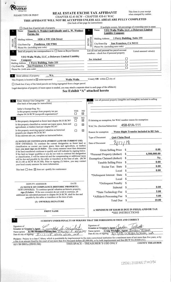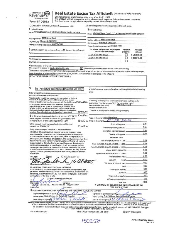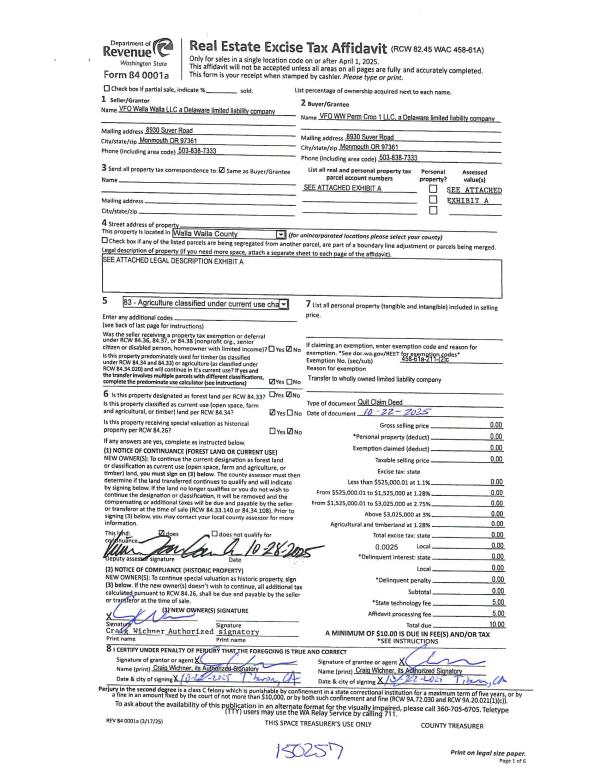 | 2 | 08/17/2018 | SWD | STATUTORY WARRANTY DEED | WEIDERT L W FARMS INC | VFO WALLA WALLA LLC | | 16-PARCELS | $14,880,000.00 | 135358 | 2018-06792 |