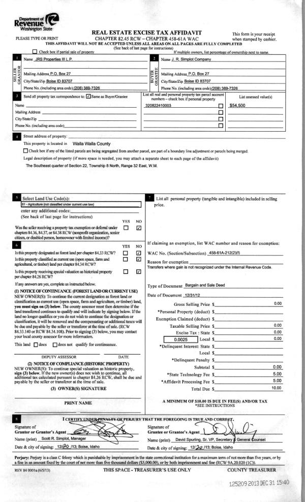 | 1 | 12/31/2013 | BARGAIN & | BARGAIN & SALE DEED | JRS PROPERTIES III LP | J R SIMPLOT COMPANY | | | | 125209 | 2013-12401 |
