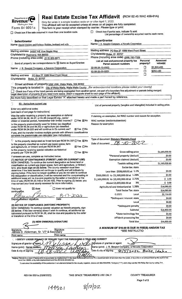 | 1 | 08/17/2022 | SWD | STATUTORY WARRANTY DEED | HOLDEN KATHRYN | J R SIMPLOT COMPANY | | 2-PARCELS | $1,100,000.00 | 144521 | 2002-06906 |