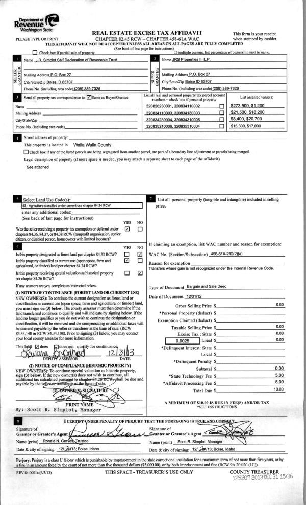 | 2 | 12/31/2013 | BARGAIN & | BARGAIN & SALE DEED | J R SIMPLOT SELF-DECLARATION | JRS PROPERTIES III LP | | | | 125207 | 2013-12399 |