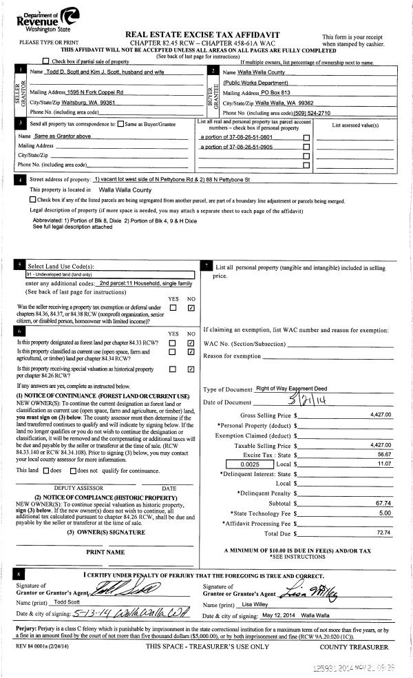 | 6 | 05/21/2014 | EASE | EASEMENT | SCOTT TODD D & KIM J | WALLA WALLA COUNTY OF | | | | 125931 | 2014-03443 |