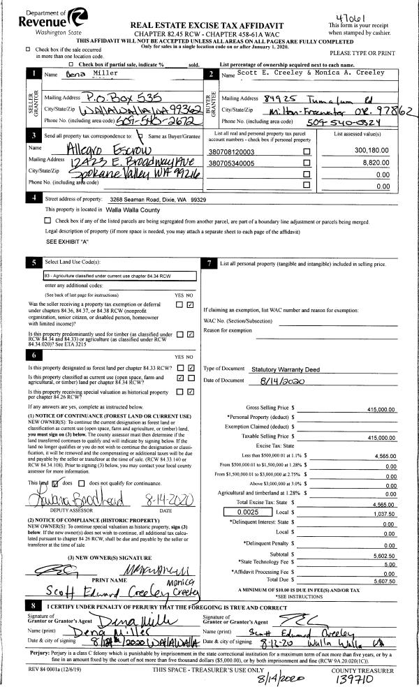 | 2 | 08/14/2020 | PACD | PURCHASER'S ASSG CONTRACT&DEED | MILLER RODNEY D & DENA L | MILLER DENA L | | 2-PARCELS | $0.00 | 139709 | 2020-08083 |