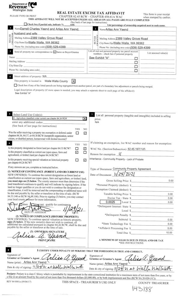 | 1 | 11/21/2021 | COMMUNITY | COMMUNITY PROPERTY AGREEMENT | YEEND DARRELL C & ARLISS A | YEEND ARLISS ANN | | | $0.00 | 143188 | 2022-00166 |