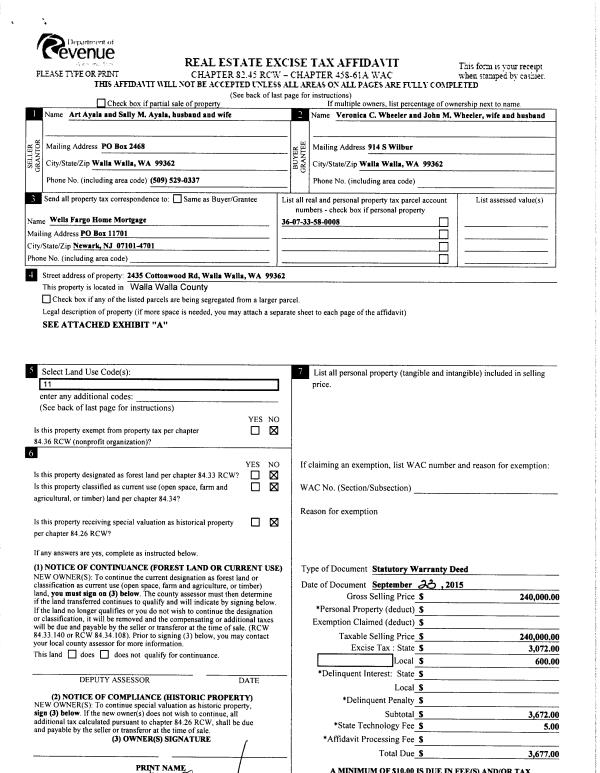 | 2 | 03/24/2008 | WARRANTY D | WARRANTY DEED | AYALA, ART & SALLY | WALLA WALLA COUNTY | | | | 114724 | 2008-02789 |