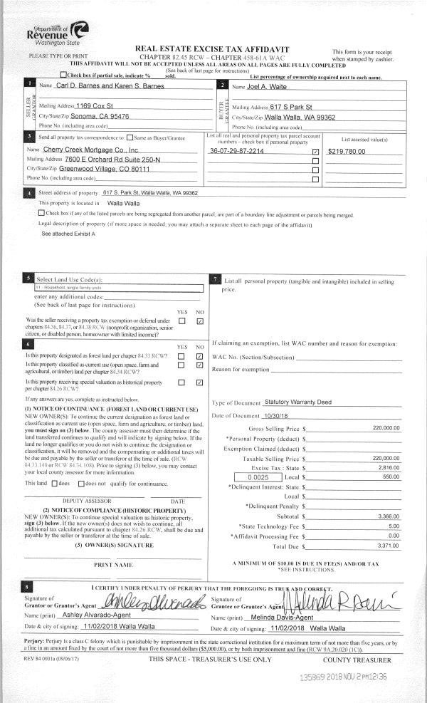 | 1 | 11/02/2018 | SWD | STATUTORY WARRANTY DEED | BARNES CARL D & KAREN S | WAITE JOEL A | | | $220,000.00 | 135869 | 2018-09131 |