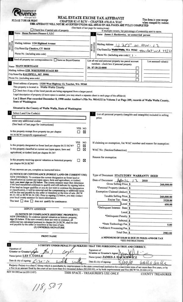| 3 | 05/21/2010 | WARRANTY D | WARRANTY DEED | HOME PARTNERS FINANCE I LLC | HACKLEWICZ, JAMES J | | | $260,000.00 | 118507 | 2010-03981 |