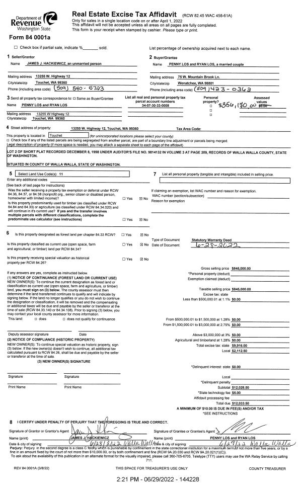 | 2 | 06/28/2022 | SWD | STATUTORY WARRANTY DEED | HACKLEWICZ JAMES J | LOS PENNY & RYAN | | | $845,000.00 | 144228 | 2022-05515 |