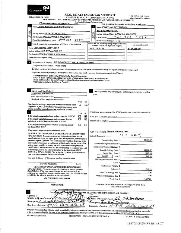 | 1 | 04/26/2019 | WARRANTY D | WARRANTY DEED | NOTTURNO BRENT & JOANN | NOTTURNO JONATHAN | | | $98,839.00 | 136750 | 2019-02650 |