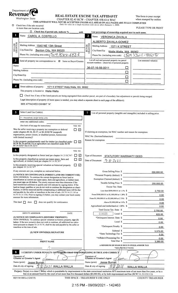 | 1 | 09/09/2021 | SWD | STATUTORY WARRANTY DEED | BISCHOFF JOANNE E ESTATE OF | ZAVALA VERONICA & ALBERTO ZAVALA-GOMEZ | | | $250,000.00 | 142463 | 2021-11117 |