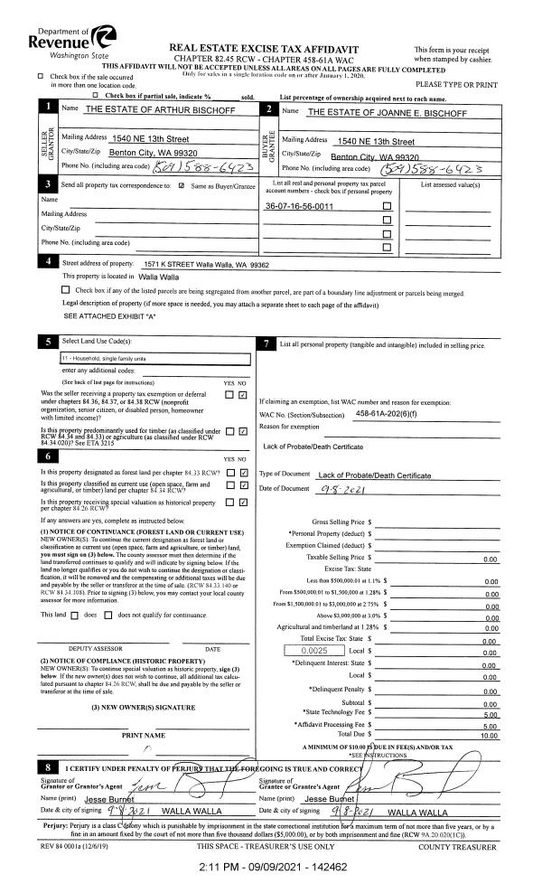| 2 | 09/08/2021 | LOPA | LACK OF PROBATE AFFIDAVIT | BISCHOFF ARTHUR ESTATE OF | BISCHOFF JOANNE E ESTATE OF | | | | 142462 | 2021-11116 |
