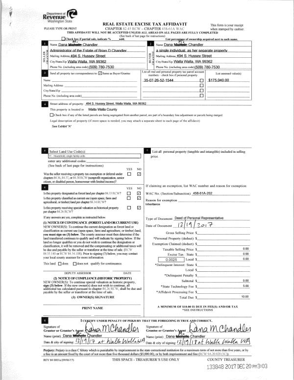 | 5 | 12/19/2017 | DPR | DEED OF PERSONAL REPRESENTATIVE | CHANDLER BRIAN D & DANA M | CHANDLER DANA M | | | $0.00 | 133848 | 2017-10246 |