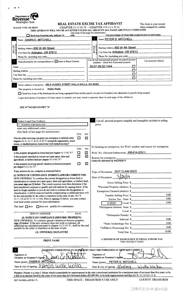 | 3 | 05/28/2019 | QCD | QUIT CLAIM DEED | MITCHELL DAWN E | MITCHELL PETER D | | | | 136949 | 2019-03603 |