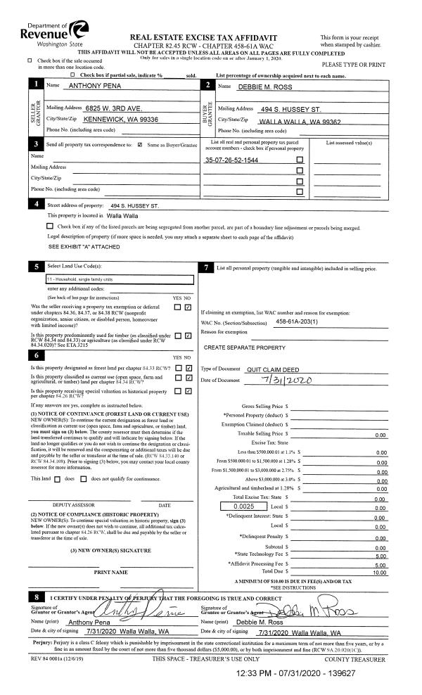 | 1 | 07/31/2020 | QCD | QUIT CLAIM DEED | PENA ANTHONY | ROSS DEBBIE M | | | | 139627 | 2020-07464 |
