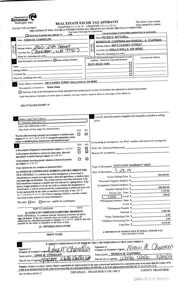 | 4 | 05/28/2019 | SWD | STATUTORY WARRANTY DEED | CHANDLER DANA M | CHAPMAN MONICA M & RANDALL A | | | $292,000.00 | 136948 | 2019-03602 |