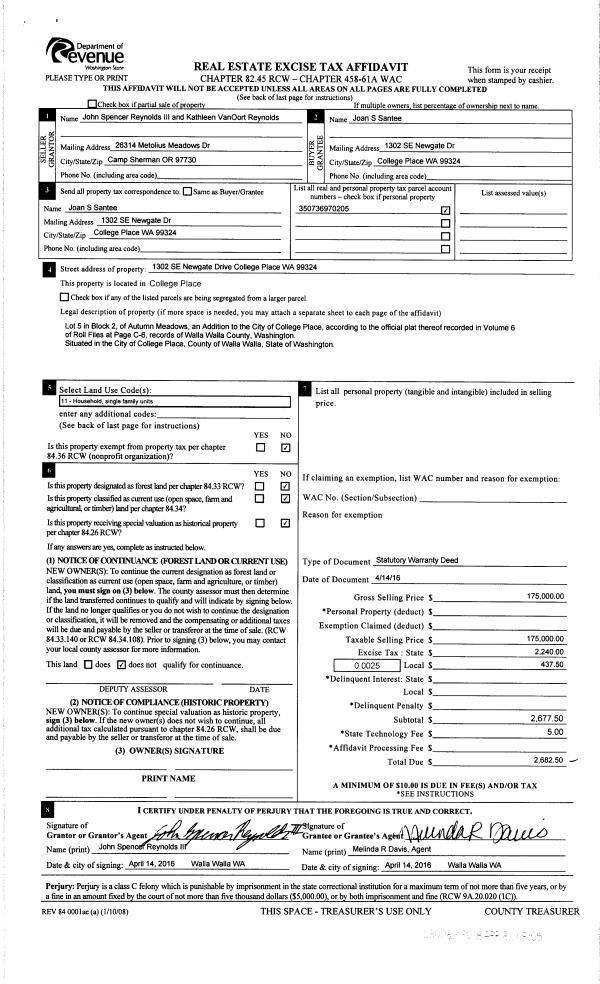| 2 | 04/21/2016 | SWD | STATUTORY WARRANTY DEED | REYNOLDS JOHN SPENCER III | SANTEE JOAN S | | | $175,000.00 | 130062 | 2016-02901 |