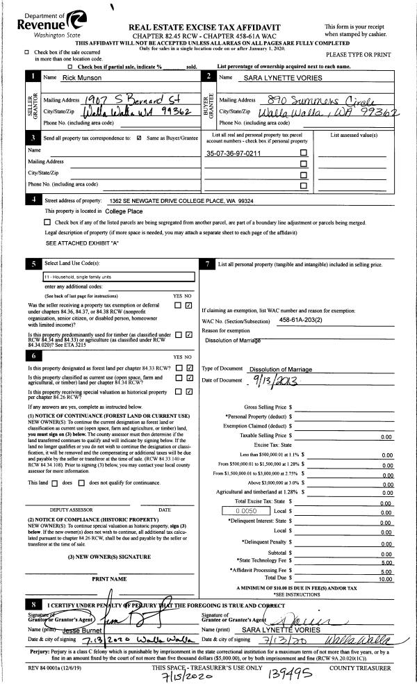 | 2 | 07/15/2020 | COURT CASE | COURT CASE | MUNSON RICK & SARA | VORIES SARA LYNETTE | | | $0.00 | 139495 | 13-9-00781-5 |