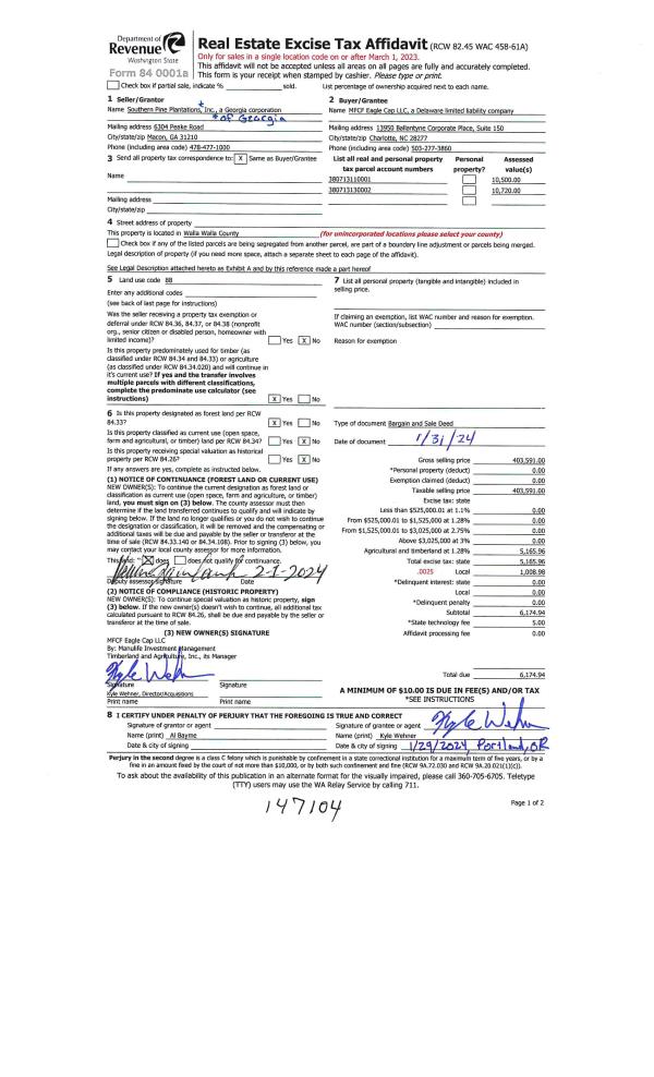 | 1 | 01/31/2024 | BARGAIN & | BARGAIN & SALE DEED | SOUTHERN PINE PLANTATIONS OF GEORGIA INC | MFCF EAGLE CAP LLC | | 2-PARCELS | $403,591.00 | 147104 | 2024-00546 |