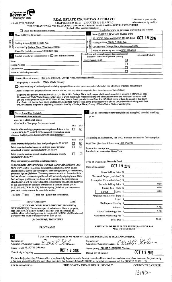 | 2 | 10/19/2016 | WARRANTY D | WARRANTY DEED | GRAHAM ELLIOT E | GRAHAM ELLIOT E LIVING TRUST | | | | 131412 | 2016-09352 |