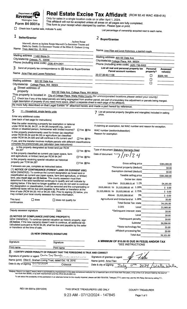 | 1 | 07/12/2024 | SWD | STATUTORY WARRANTY DEED | GRAHAM ELLIOT E LIVING TRUST | FILAN AME & LEXEE ROBERTSON | | | $381,000.00 | 147845 | 2024-03749 |