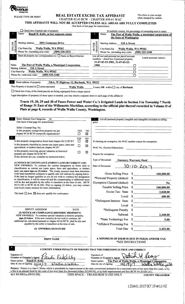 | 1 | 10/19/2017 | SWD | STATUTORY WARRANTY DEED | KELLY RANDI D | PORT OF WALLA WALLA | | 2-PARCELS | $160,000.00 | 133441 | 2017-08342 |