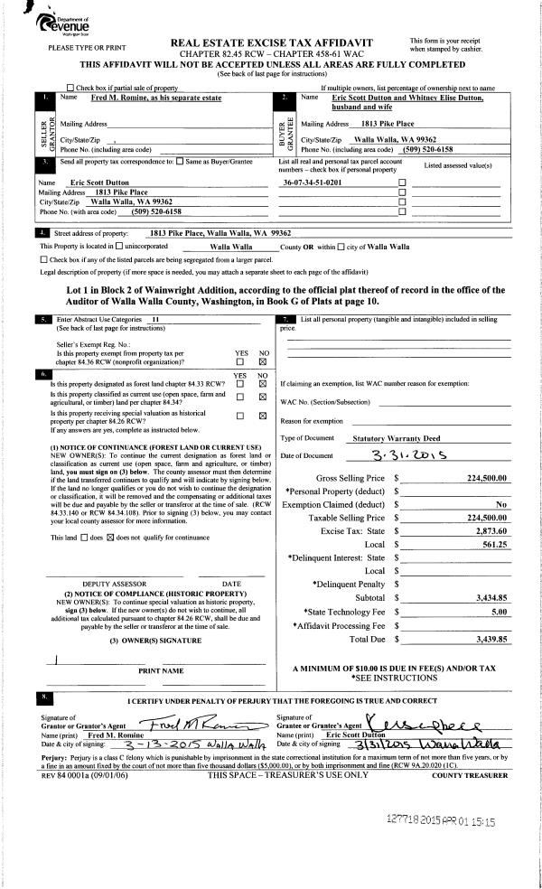 | 2 | 04/01/2015 | SWD | STATUTORY WARRANTY DEED | ROMINE FRED M | DUTTON ERIC SCOTT & WHITNEY ELISE | | | $224,500.00 | 127718 | 2015-02684 |