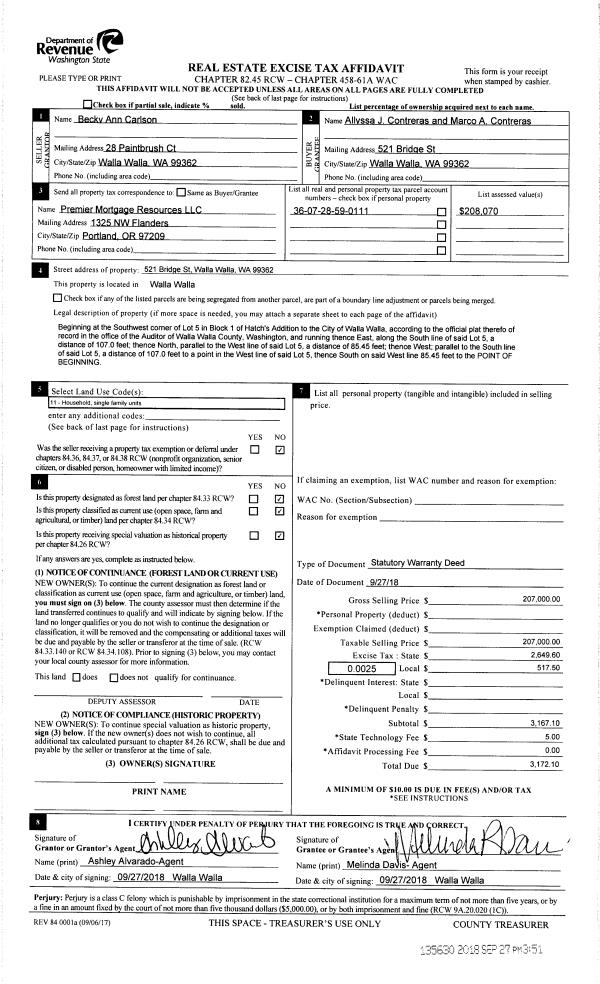 | 1 | 09/27/2018 | SWD | STATUTORY WARRANTY DEED | CARLSON BECKY ANN | CONTRERAS MARCO A & ALLYSSA J | | | $207,000.00 | 135630 | 2018-08065 |