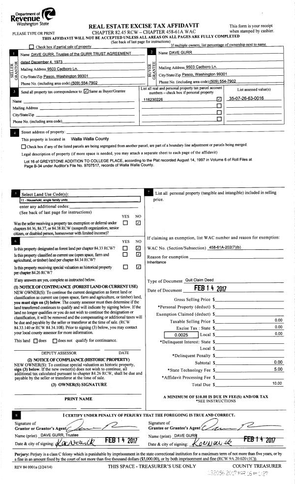 | 2 | 02/14/2017 | QCD | QUIT CLAIM DEED | GURR TRUST AGREEMENT | GURR DAVID | | | $0.00 | 132056 | 2017-02045 |