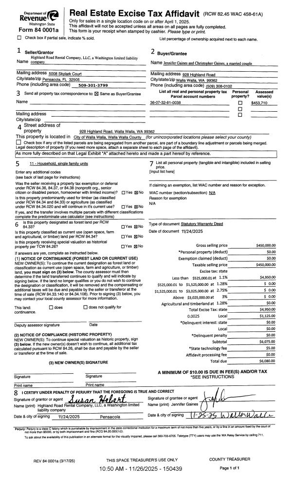 | 1 | 11/26/2025 | SWD | STATUTORY WARRANTY DEED | HIGHLAND ROAD RENTAL COMPANY LLC | GAINES JENNIFER & CHRISTOPHER | | | $450,000.00 | 150439 | 2025-07340 |