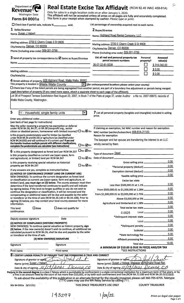 | 2 | 11/19/2021 | SWD | STATUTORY WARRANTY DEED | HEBERT SUSAN | HIGHLAND ROAD RENTAL COMPANY LLC | | | $0.00 | 143297 | 2022-00768 |