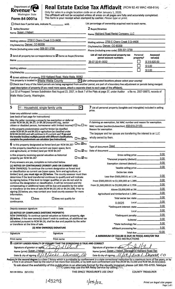 | 1 | 11/19/2021 | SWD | STATUTORY WARRANTY DEED | HEBERT SUSAN | HIGHLAND ROAD RENTAL COMPANY LLC | | | $0.00 | 143298 | 2022-00769 |
