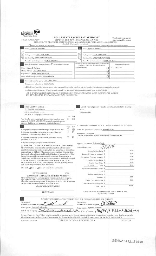 | 3 | 07/18/2014 | QCD | QUIT CLAIM DEED | ALEXENKO LANDON | RICHARDS ALYSSA S | | | | 126276 | 2014-05058 |