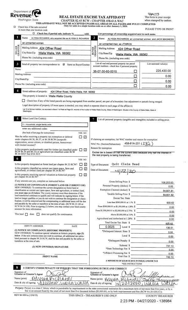 | 2 | 04/27/2020 | QCD | QUIT CLAIM DEED | RICHARDS ALYSSA S | RICHARDS ALYSSA & JACK MAGNESS | | | $54,602.00 | 138984 | 2020-03593 |