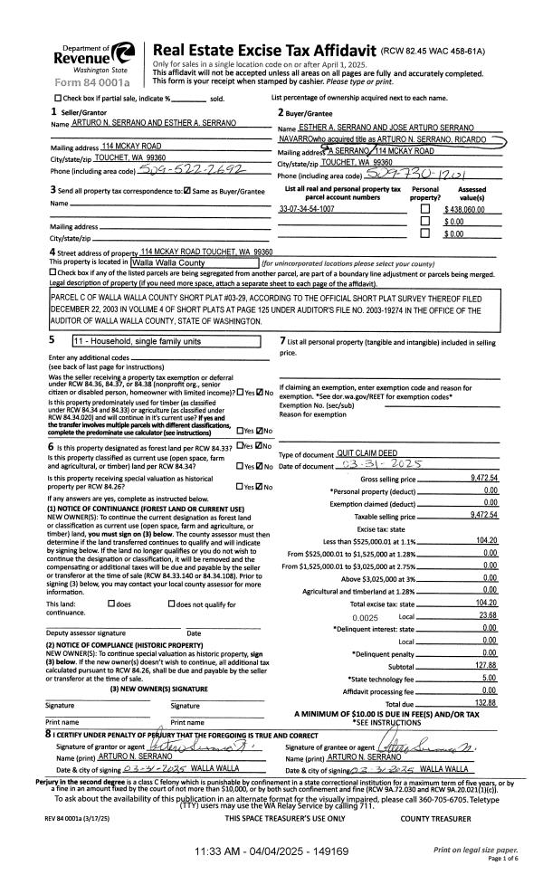 | 1 | 04/04/2025 | QCD | QUIT CLAIM DEED | SERRANO ARTURO N & ESTHER A | SERRANO ESTHER A | | | $9,473.00 | 149169 | 2025-01774 |