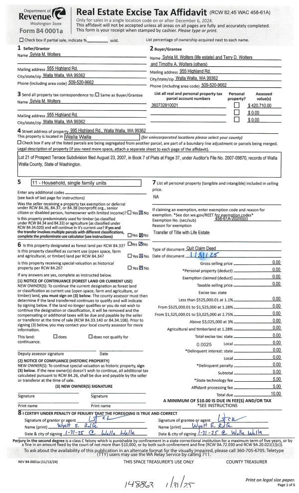 | 1 | 01/31/2025 | QCD | QUIT CLAIM DEED | WOLTERS SYLVIA M | WOLTERS SYLVIA M LIFE ESTATE | | | | 148863 | 2025-00528 |