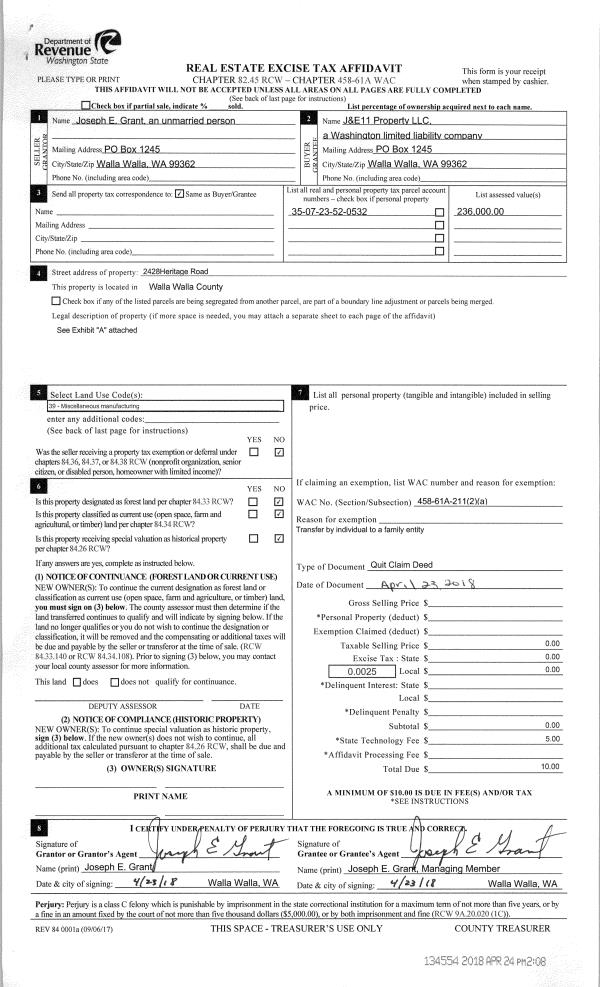 | 2 | 04/23/2018 | QCD | QUIT CLAIM DEED | GRANT JOSEPH E | J&E11 PROPERTY LLC | | | $0.00 | 134554 | 2018-03199 |