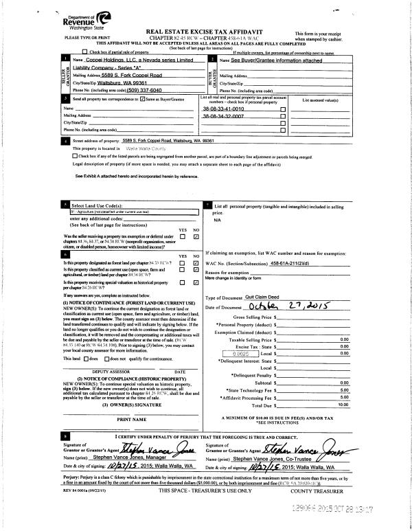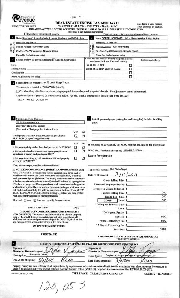 | 2 | 04/27/2011 | QCD | QUIT CLAIM DEED | JONES, STEPHEN V & CINDY S | COPPEI HOLDINGS LLC | | | | 120053 | 2011-03367 |