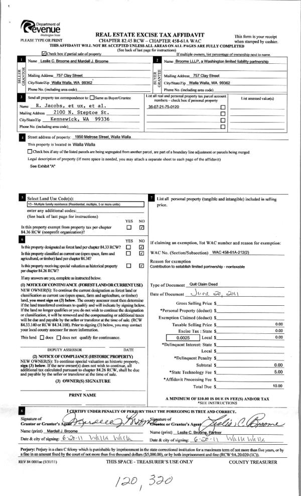 | 4 | 06/28/2011 | QCD | QUIT CLAIM DEED | BROOME, LESLIE C & MARDELL J | BROOME LLLP | | | | 120320 | 2011-05002 |