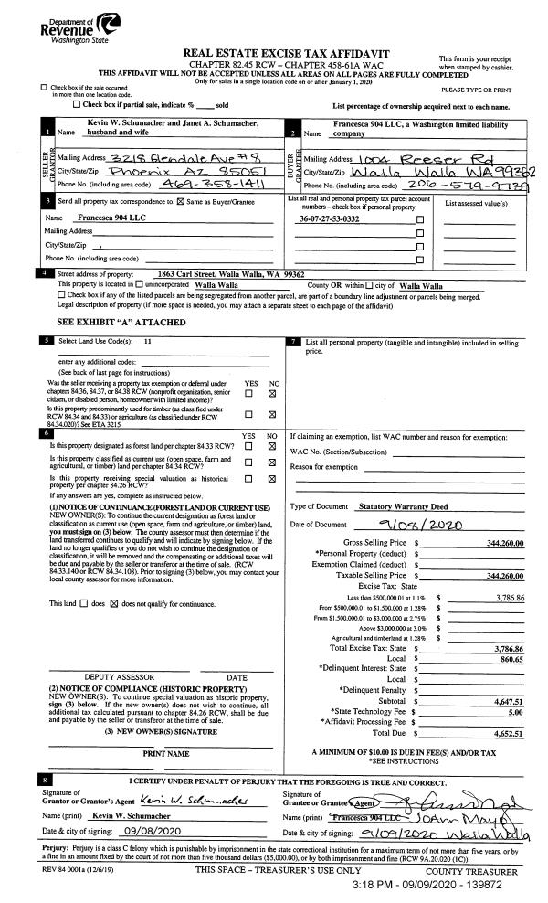 | 2 | 09/09/2020 | SWD | STATUTORY WARRANTY DEED | SCHUMACHER KEVIN W & JANET A | FRANCESCA 904 LLC | | | $344,260.00 | 139872 | 2020-09167 |
