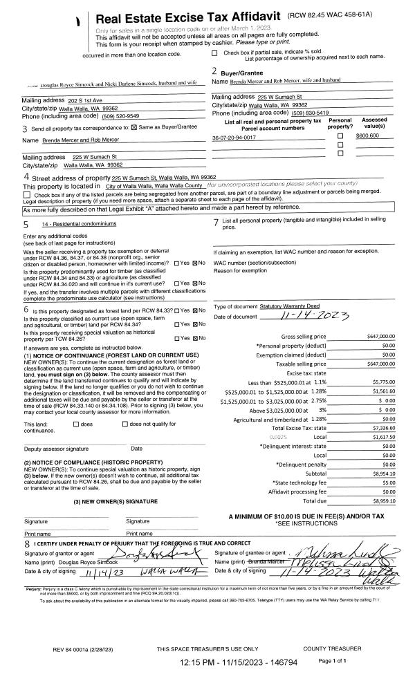 | 2 | 11/15/2023 | SWD | STATUTORY WARRANTY DEED | SIMCOCK DOUGLAS ROYCE & NICKI DARLENE | MERCER BRENDA & ROB | | | $647,000.00 | 146794 | 2023-06681 |