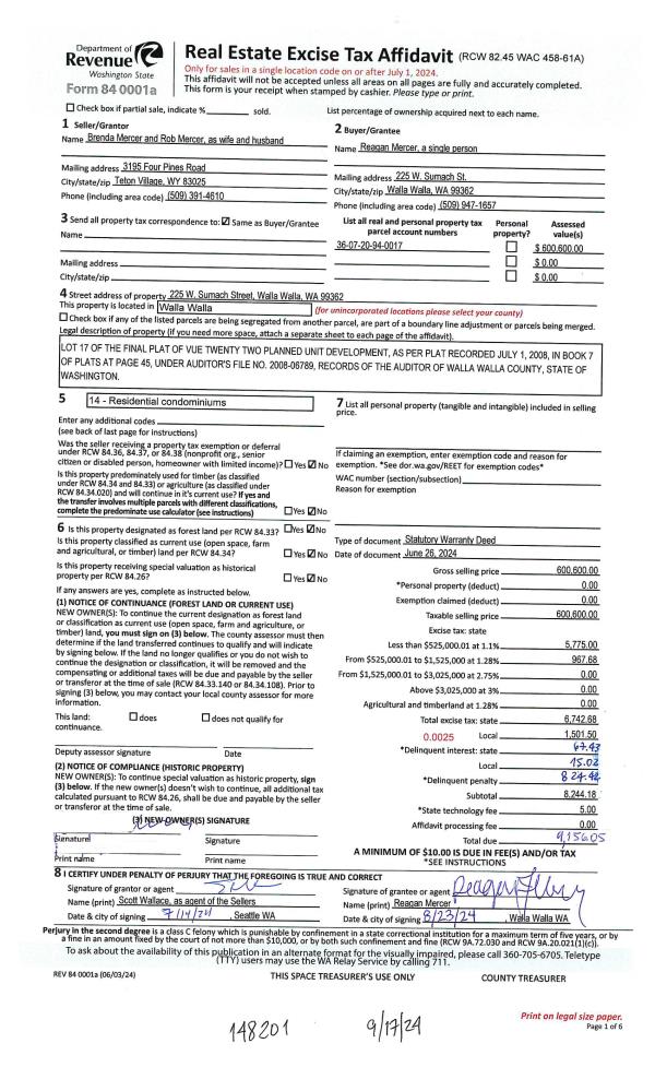 | 1 | 09/17/2024 | SWD | STATUTORY WARRANTY DEED | MERCER BRENDA & ROB | MERCER REAGAN | | | $600,600.00 | 148201 | 2024-05305 |